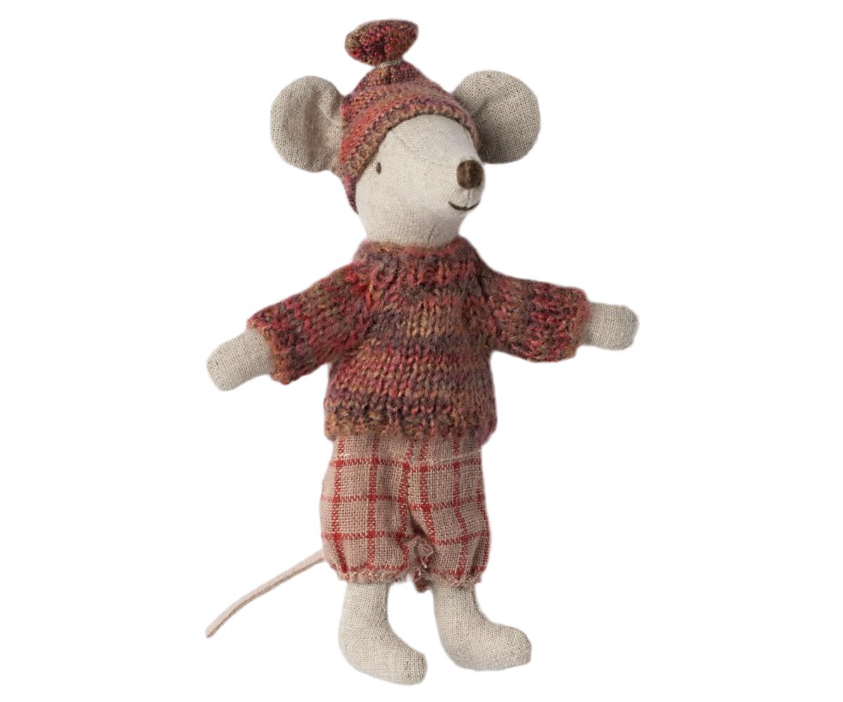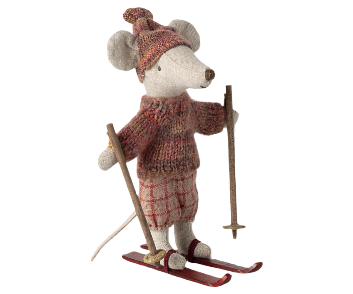 Maileg Winter Big Sister Mouse is all ready for plenty of fun on the slopes with her friends or for skiing to school through the snow. Big Sister Mouse is warmly dressed in a snug knitted jumper with shades of rose colouring, checked trousers and with her wooden skis and poles she’s perfectly prepared for any winter adventure with her family. Big sister mouse finishes her outfit with a little knitted bobble hat to keep her ears warm and toasty in the cold weather.