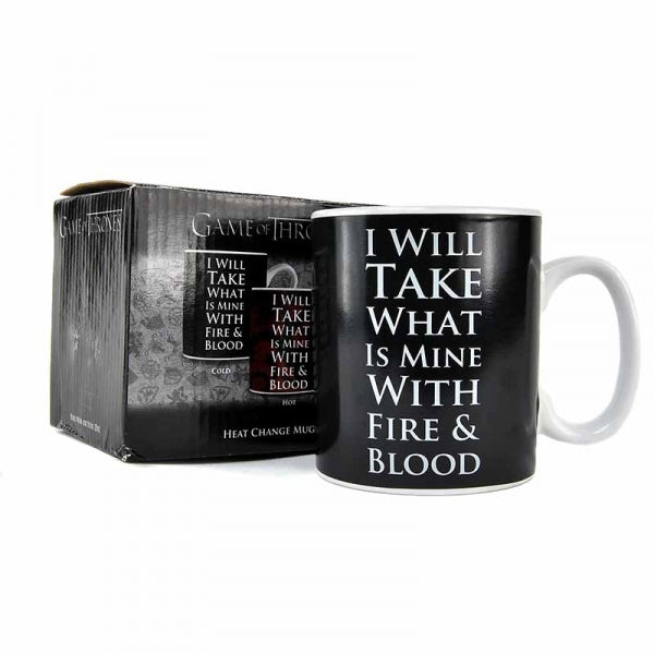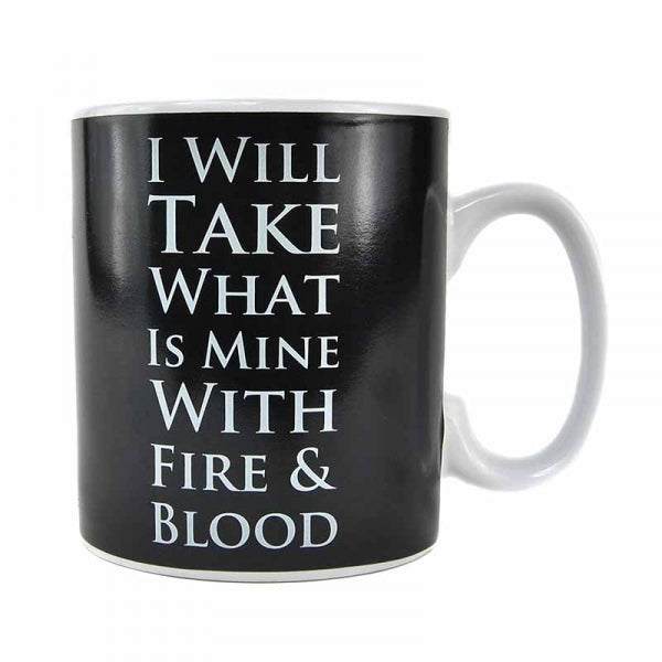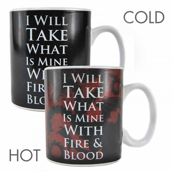 When cold the mug has Daenerys famous quote 'I will take what is mine with Fire and Blood' on the front. On the back is a three headed dragon, the sigil of House Targaryen.