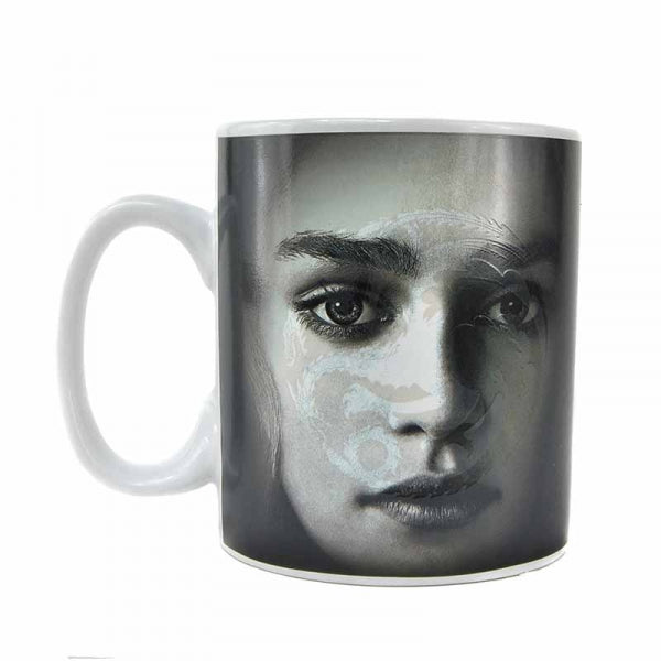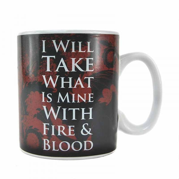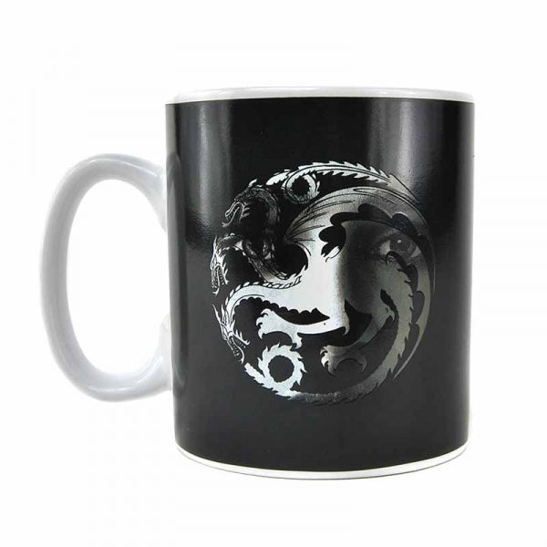 When hot the Targaryen Sigil, a three headed dragon appears in red behind the quote on the front and an image of Daenerys Targaryen appears on the back. As the mug cools it returns to its original state.