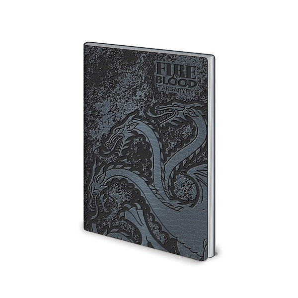 Grey A5 faux leather soft flexi cover notebook with a debossed image of the 3 headed dragon, the sigil of House Targaryen with their moto 'Fire and Blood' on the front and the Direwolf, the sigil of House Stark with their moto 'Winter is Coming' on the back.