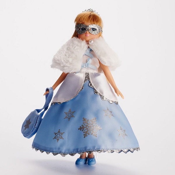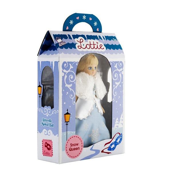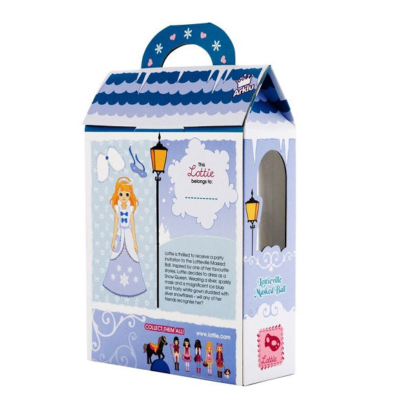 She is packaged in a reusable box with handle and on the back it reads: "Lottie is thrilled to receive a party invitation to the Masked Ball. Inspired by one of her favourite stories, Lottie decides to dress as a Snow Queen. Wearing a silver, sparkly mask and a magnificent ice blue and frosty white gown studded with silver snowflakes but will any of her friends recognise her?"