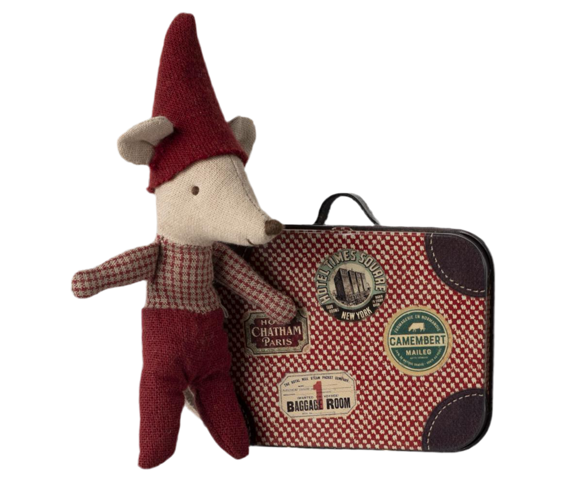This Christmas Baby Mouse is dressed in his finest red festive outfit and with his own suitcase he is ready to embark on any Holiday adventures. When tired from all his Yuletide fun he has a warm and cosy red knitted blanket to snuggle under in his suitcase whilst he sleeps. Let this Christmas Baby Mouse be your festive friend and bring some Holiday cheer to this special time of year.